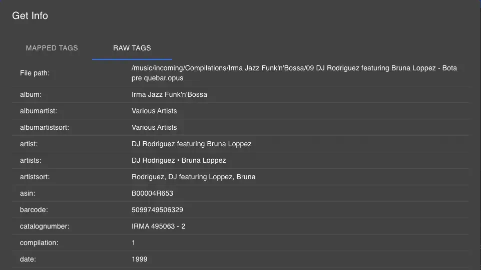 as expected. You can check the tags of any file in Navidrome by looking at the “Get Info”->“Raw Tags” tab: